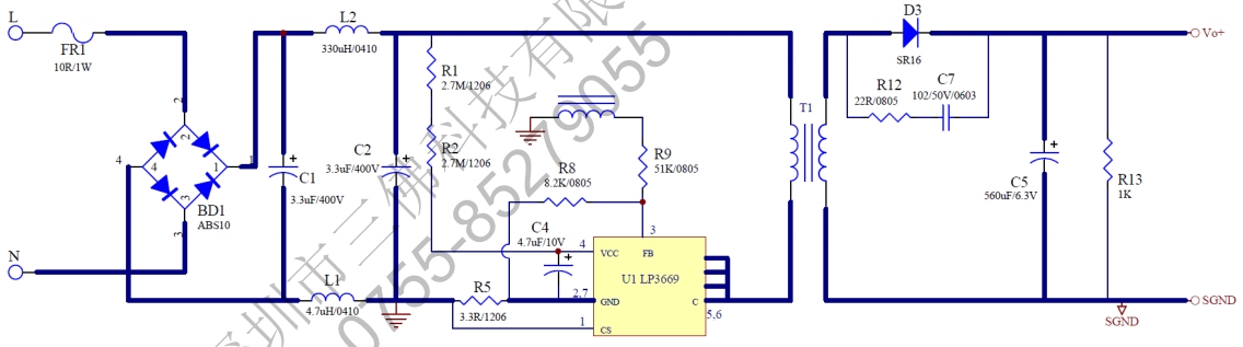电路设计:LP3669A适用于双绕组原边反馈控制,系统工作于断续模式,适用于充电器和适配器以及其他辅助类电源。LP3669A采用特有的输出线损补偿技术,可以有效的补偿输出电流在输出线上的损耗压降;恒压时,采用谷底导通技术,提升恒压效率。
