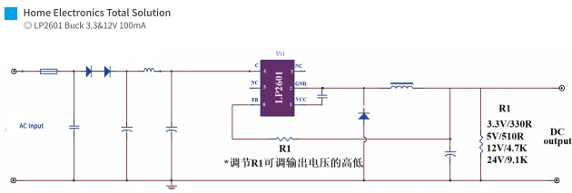 LP2601:适用于OR模式,输出电压可调的Buck降压电路,推荐电压为3.3V或5V,最大输出电流可达100mA。这款芯片适合需要灵活电压调节的应用场景。