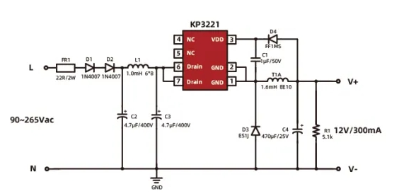 集成700V MOSFET和高压启动电路,确保稳定启动。