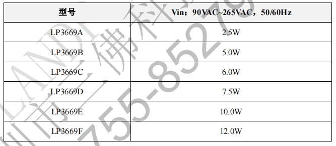 在电源设计领域,选择合适的控制芯片对于确保电源转换效率和稳定性至关重要。LP3669是一款高性能的双绕组原边反馈控制芯片,广泛应用于AC-DC转换器设计中。该芯片支持90VAC至265VAC的输入电压范围,并能在50/60Hz的频率下工作。LP3669系列提供了多种型号,每种型号对应不同的输出功率,后缀从A到F,分别对应2.5W至12W的输出功率。本文将探讨这些不同后缀型号的LP3669芯片是否可互换使用,以及它们在电源设计中的应用。