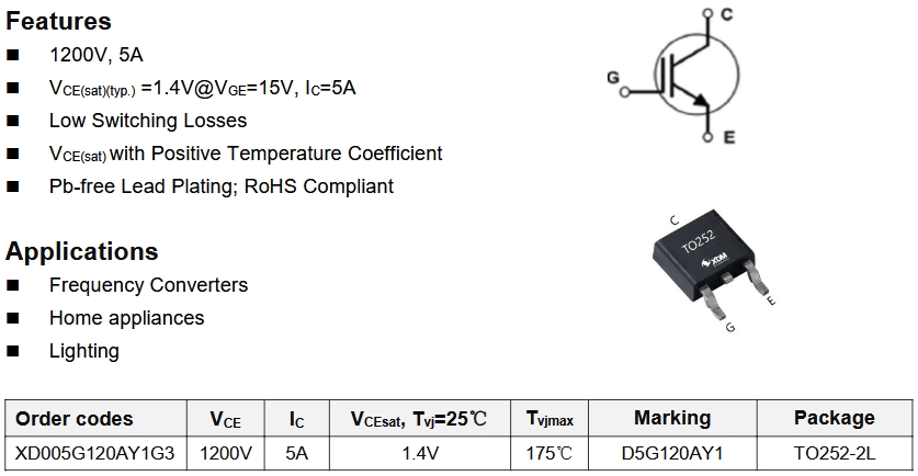 XD005G120AY1G3以其5A的电流等级,适用于较低功率的充电枪。它的1200V电压等级确保了在高电压充电场景下的安全性。T0-252-3L封装类型提供了良好的散热性能,适合于充电枪的紧凑设计。