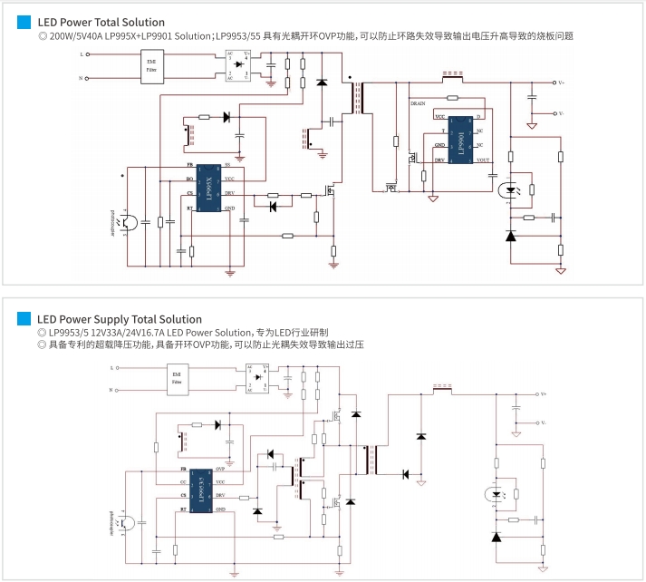 对于100~200W的LED照明系统,推荐使用LP9952/53或LP9955/56作为PWM控制器,以及LP9901/LP9911作为SR控制器。这种配置提供了开环限压功能,确保了高可靠性和低成本。推荐的电压配置为5V40A,足以满足中等功率LED灯具的需求。