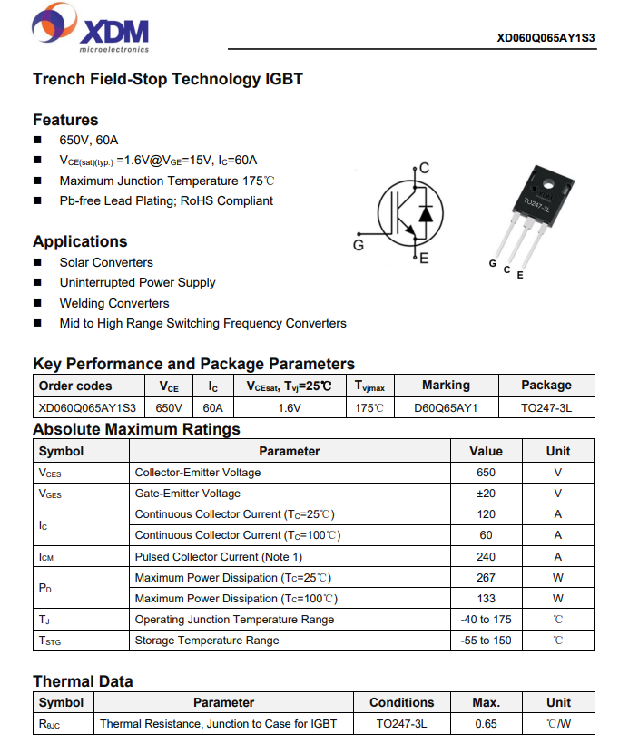 XD060Q065AY1S3芯达茂 国产IBGT +FRD单管 60A 650V TO-247-3L